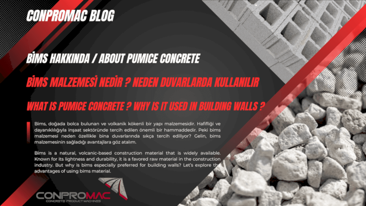 Bims, doğal ve volkanik bir yapı malzemesidir. İnşaat sektöründe tercih edilir çünkü hafif, dayanıklı, ısı ve ses yalıtımı sağlar. Bina ağırlığını azaltır, yangına dayanıklı ve kolay işlenebilir. Bu nedenle modern inşaatta sıkça kullanılır.